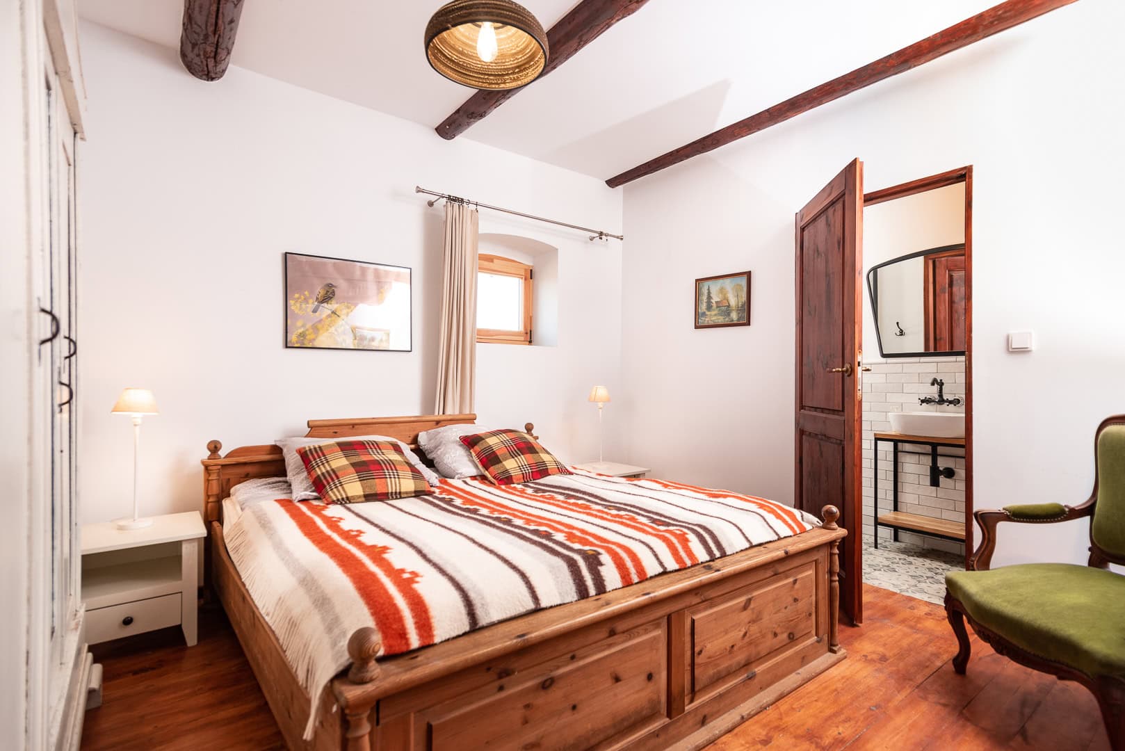 Boćki otaczają nas z każdej strony. A Bocian gniazda bocianiego jest najbliżej! Wystarczy zerknąć za okno i już podpatrujemy cierpliwych rodziców czy pierwsze, niezdarne próby lotu młodzieży. W nas krew płynie trochę szybciej na wieści o innym bocianie – czarnym! Jest zupełnym przeciwieństwem swojego kuzyna. Trzyma się jak najdalej ludzi, w leśnych gęstwinach. Tu jest królem potoków i strumieni. W tajemnicy zdradzimy wam, że w okolicy i czarnego bociana spotkać możemy. Wyprawy na ptasie obserwacja najlepiej organizować w czasie pobytu dużą grupą w apartamencie Bocian. Ma on duży salon z kominkiem, sofą, stołem i aneksem kuchennym. W głównej sypialni jest łóżko podwójne, a w dwóch pozostałych – cztery pojedyncze łóżka. Apartament znajduje się w budynku wozowni, na parterze, ma niezależne wejście i ganek. Jest zatem trzysezonowy, choć zapraszamy gości również w zimie – wówczas najważniejszym elementem wyposażenie stanie się z pewnością kominek! Umili gościom chłodniejsze wieczory, które można spędzić np. przy naszej herbacie z bzu i grach planszowych :)
